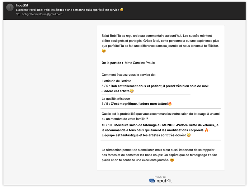 Similarly, software such as InputKit allows you to automatically share positive feedback from satisfied customers with your staff. This feature will allow you to empower your teams while showing them the concrete impact their service has on customer satisfaction. Thus, the relevant comments and positive opinions collected during satisfaction surveys will motivate them to give the best of themselves in order to improve the quality of their services.