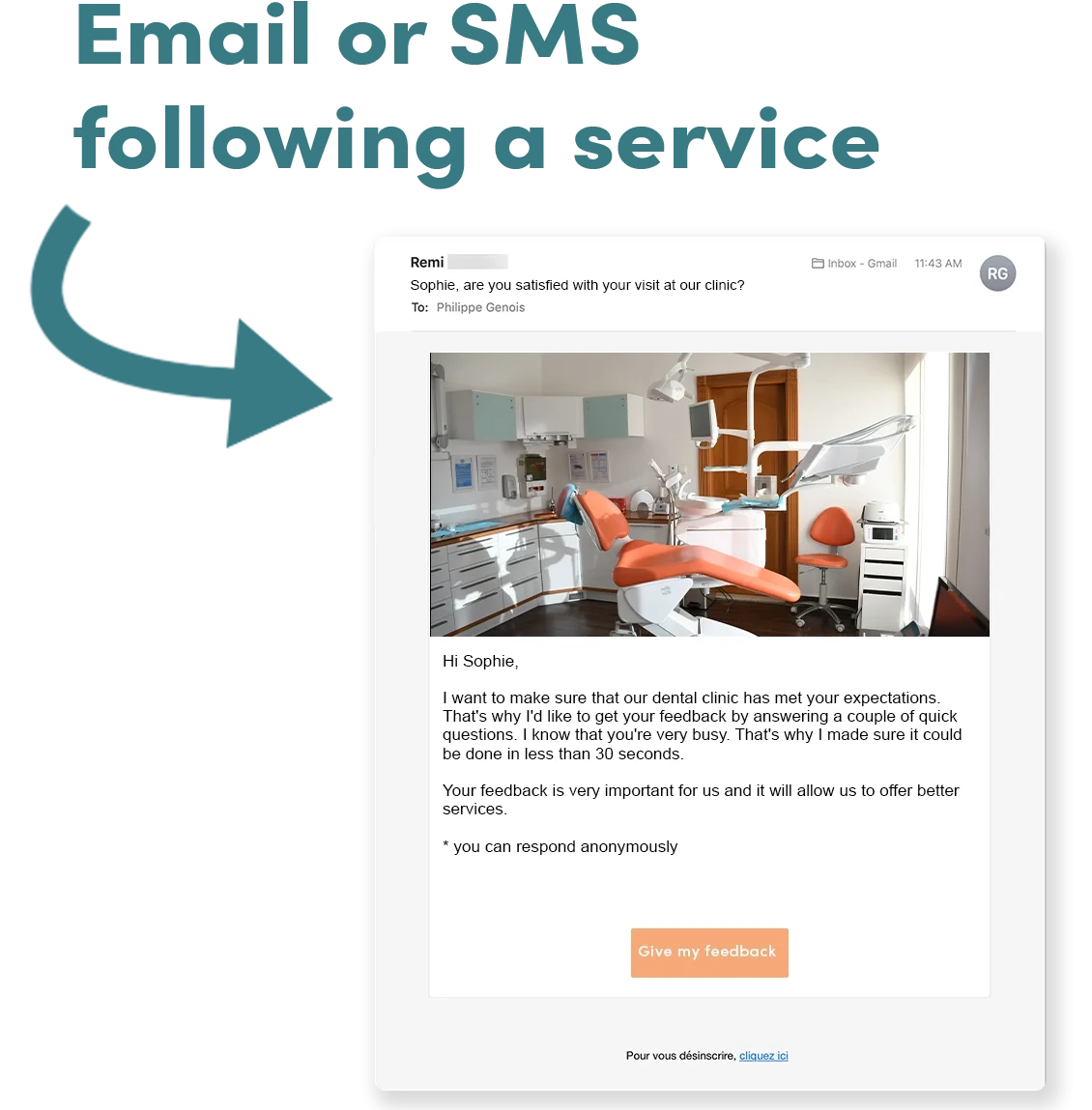 By combining Progident with our solution, you can optimize your dental clinic’s experience according to the concrete needs of your patients. After a clinic appointment, send your patients a personalized, automated satisfaction survey to obtain their opinions. We follow best practices: your surveys will be sent at the right time, one to two hours after a clinic appointment. This will help you learn more about the quality of your treatments and help you make informed decisions to improve your patient experience. Our average response rate of 49% per email and 57% per text message (SMS) ensures that you gather a lot of feedback in order to customize your services according to the concrete needs of your patient. By knowing your patients’ real opinions, you can offer them an experience that meets their expectations!