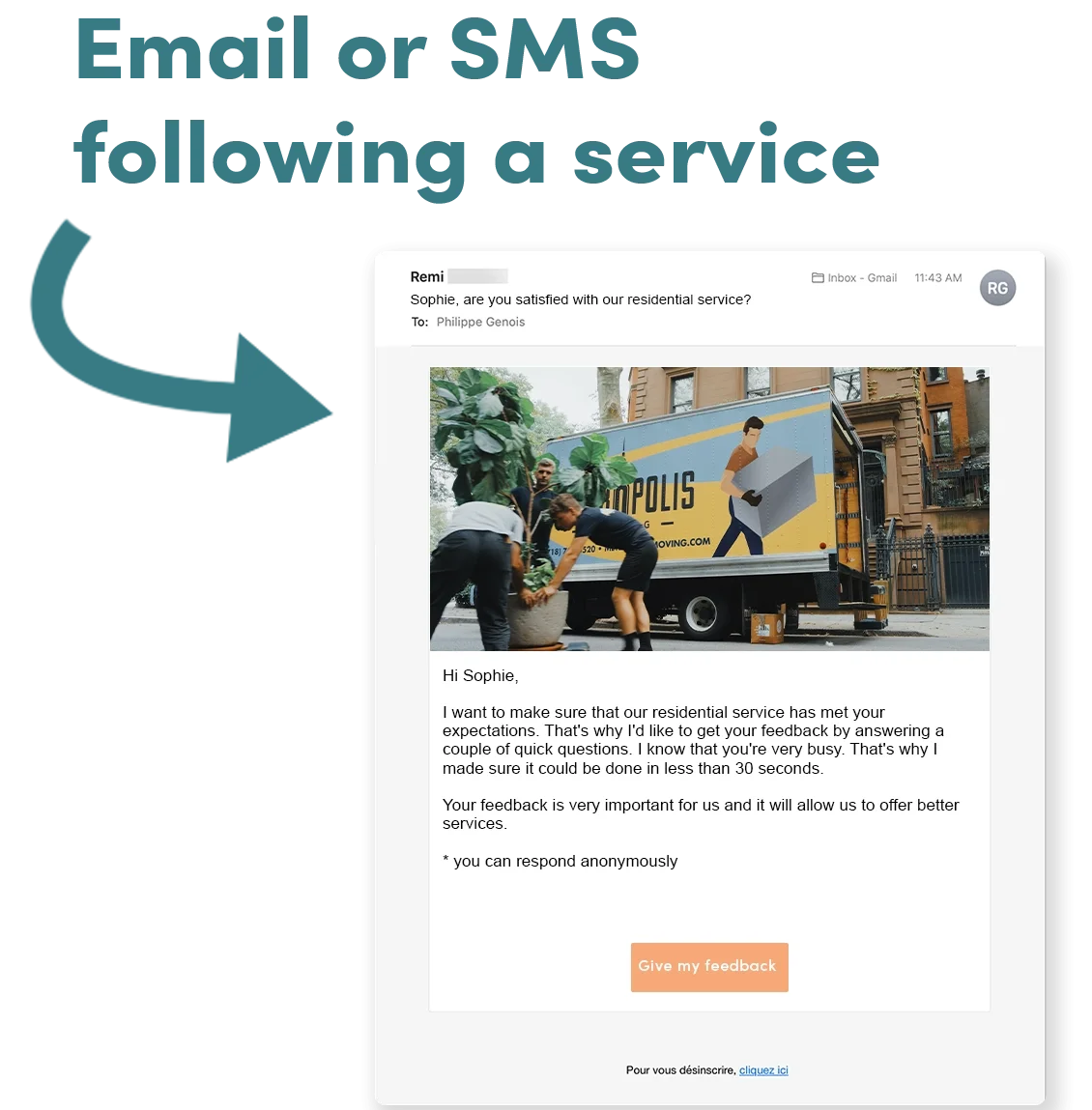 By combining ServiCentre with our solution, you can continuously improve your customer experience according to your customers’ needs. After a lived experience, send your customers an automated and personalized satisfaction survey in order to get rich feedback. Follow best practices: schedule your survey at the right time, one to two hours after the experience, for optimal results. This feedback will help you make informed decisions to better adapt your experience to the real needs of your customers. With our average response rate of 49% by email and 57% by text message (SMS), you will receive a lot of feedback in order to personalize your services according to the results obtained. By knowing the true opinion of your customers, you can offer them an experience that meets their expectations!