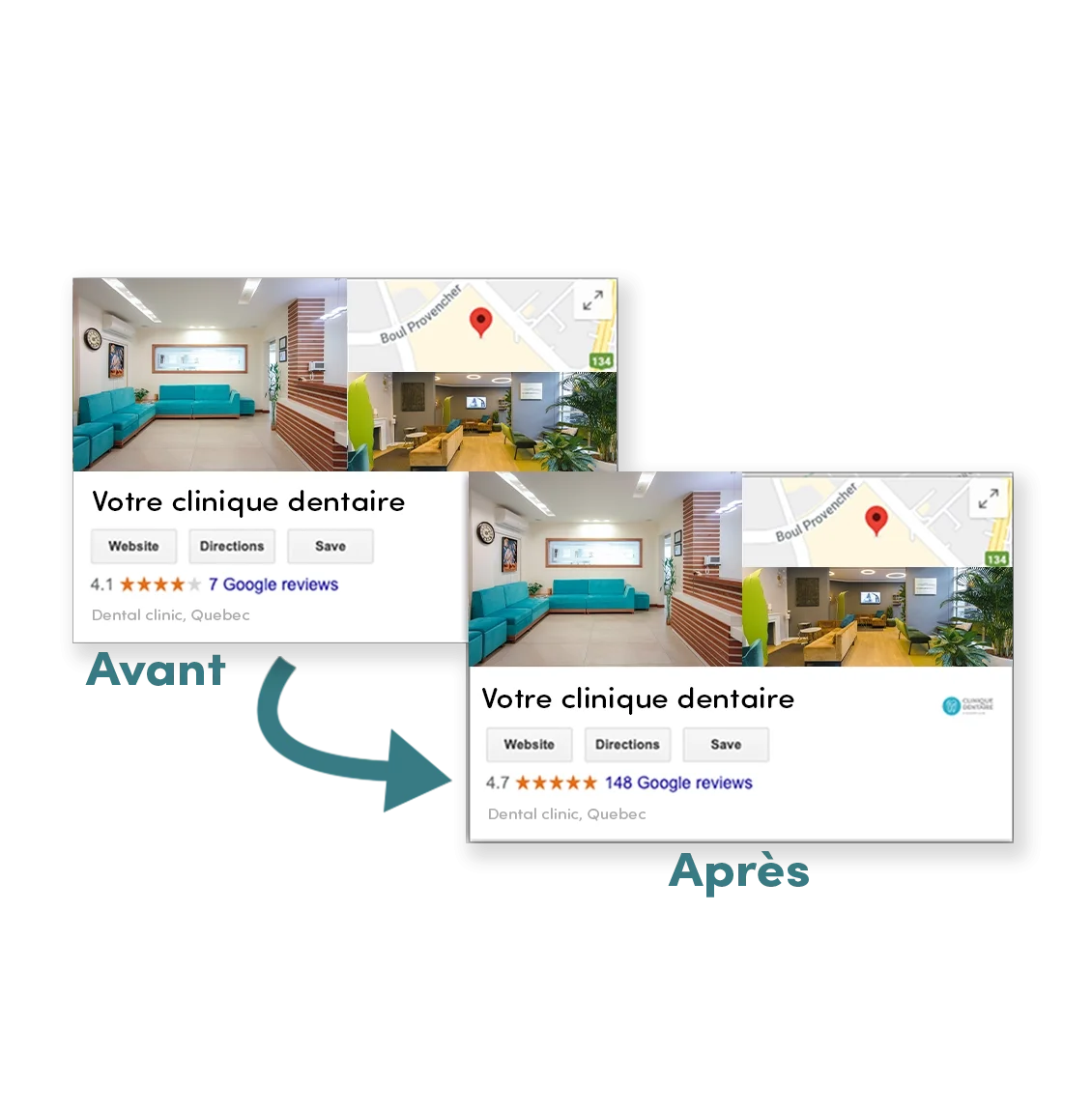 Profitez de notre intégration avec Dentitek pour attirer de nouveaux patients au sein de votre clinique dentaire. Pour chaque questionnaire complété, InputKit invite automatiquement vos patients satisfaits à vous laisser un avis positif en ligne. Cette stratégie consistant à cibler vos ambassadeurs augmente en moyenne de trois à dix fois vos avis Google par mois. Avec un tel volume d’avis Google positifs, vous améliorerez votre réputation en ligne ainsi que votre visibilité sur les moteurs de recherche. Vos prospects seront donc assurés de votre fiabilité et se tourneront vers votre clinique pour de futurs services!