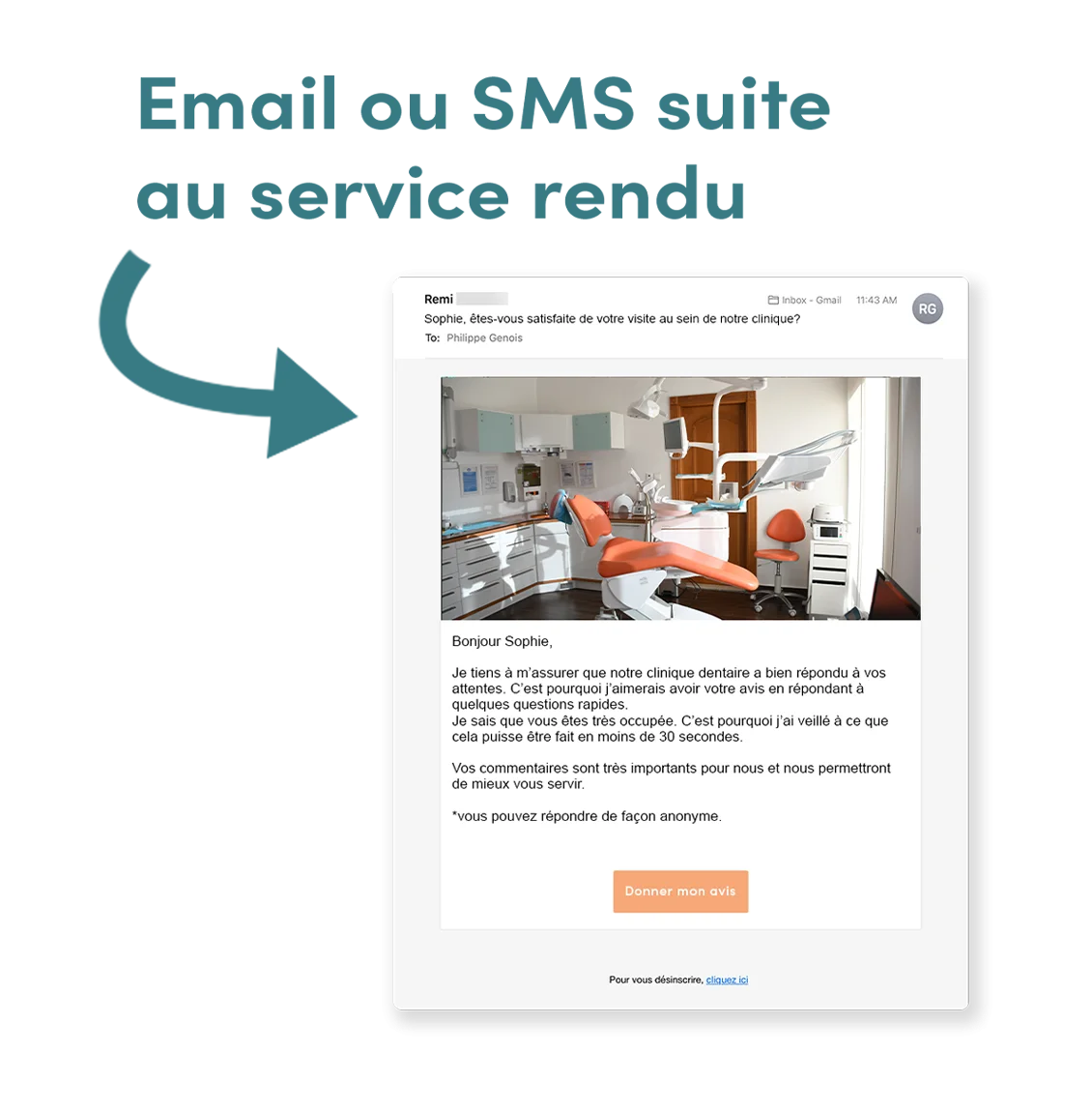 Avec notre intégration à Dentitek, optimisez l’expérience patient en clinique dentaire. À la suite d’un rendez-vous avec vos dentistes, envoyez à vos patients un questionnaire de satisfaction personnalisé et automatisé afin de savoir ce qu’ils pensent de vos services. Programmez l’envoi de vos questionnaires au bon moment, soit une à deux heures après le rendez-vous en clinique, afin de récolter des rétroactions détaillées et pertinentes. Notre taux de réponse moyen de 57% par message texte (SMS) et de 49% par courriel vous garantit d’obtenir de nombreux commentaires, peu importe la méthode d’envoi choisie. Vous pourrez ainsi mieux vous adapter aux besoins concrets de votre patientèle et prendre des décisions éclairées. Avec InputKit et Dentitek, offrez à vos patients une expérience en clinique dentaire à la hauteur de leurs attentes!