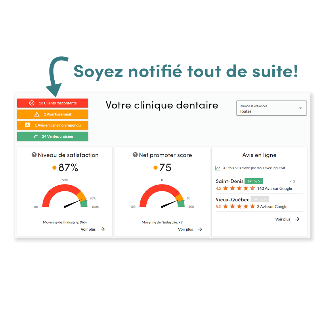 Grâce à notre connexion à Dentitek, détectez jusqu’à trois fois plus de patients insatisfaits au sein de votre clinique dentaire. Via notre tableau de bord centralisé et performant, soyez notifié en temps réel pour être notifié de manière automatisée en cas d’insatisfaction patient. Nos fiches patients détaillées permettront à vos équipes d’effectuer un suivi proactif de la satisfaction patient jusqu’à ce que la situation soit réglée. Cette gestion rapide des patients mécontents vous aidera à transformer vos détracteurs en promoteurs!
