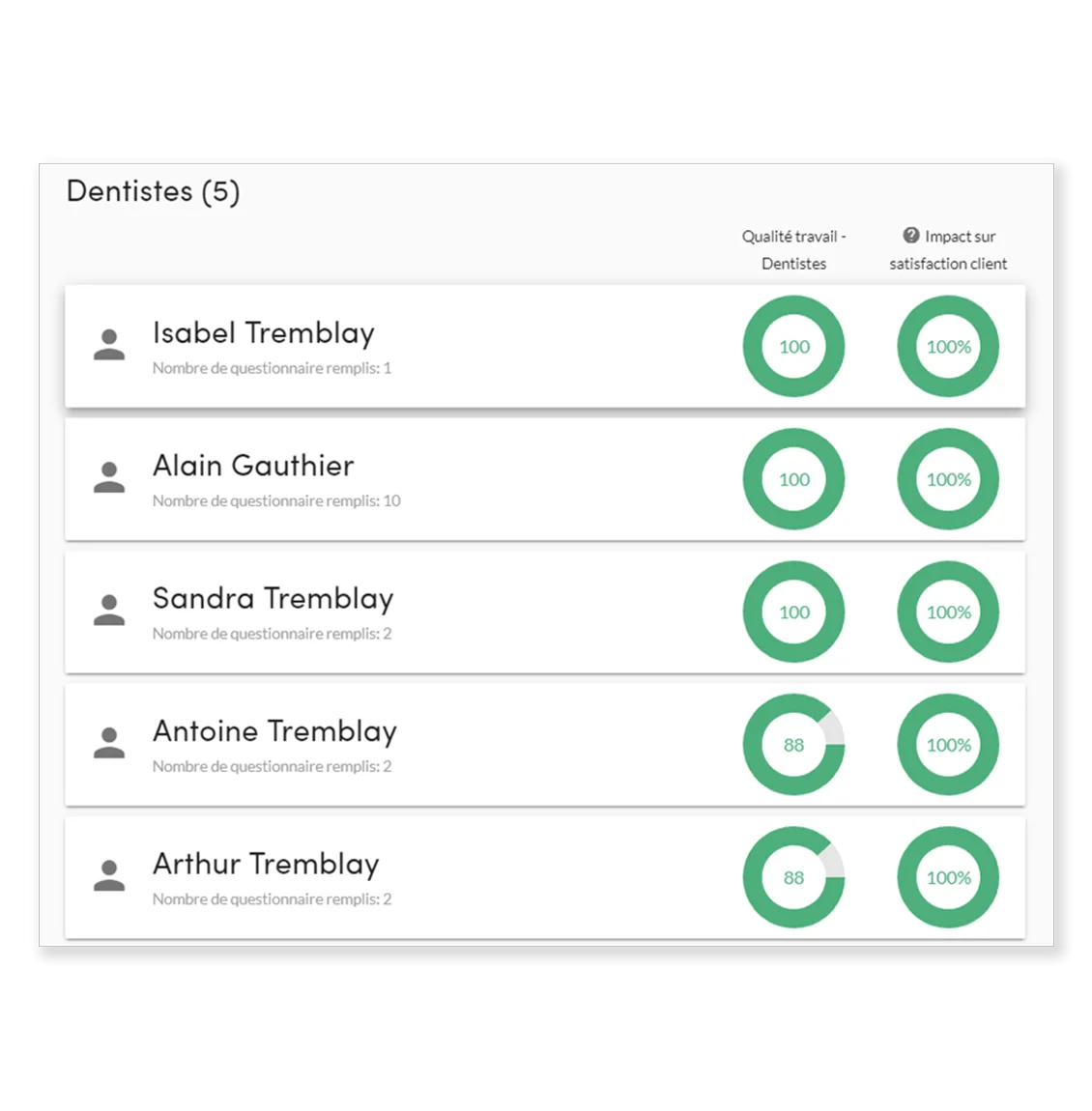 Avec notre connexion à Dentitek, obtenez une meilleure vue d’ensemble sur les services et traitements offerts dans votre clinique dentaire. Via notre tableau de bord performant et intuitif, vous pourrez constater en un coup d’œil les rapports de performance individuels de tous vos employés. Ces métriques pertinentes basées sur les rétroactions de vos patients vous permettront de mieux évaluer vos secrétaires, dentistes et hygiénistes dentaires. Ainsi, vous pourrez mieux les responsabiliser face au service rendu et adapter leur formation selon les commentaires patients obtenus.