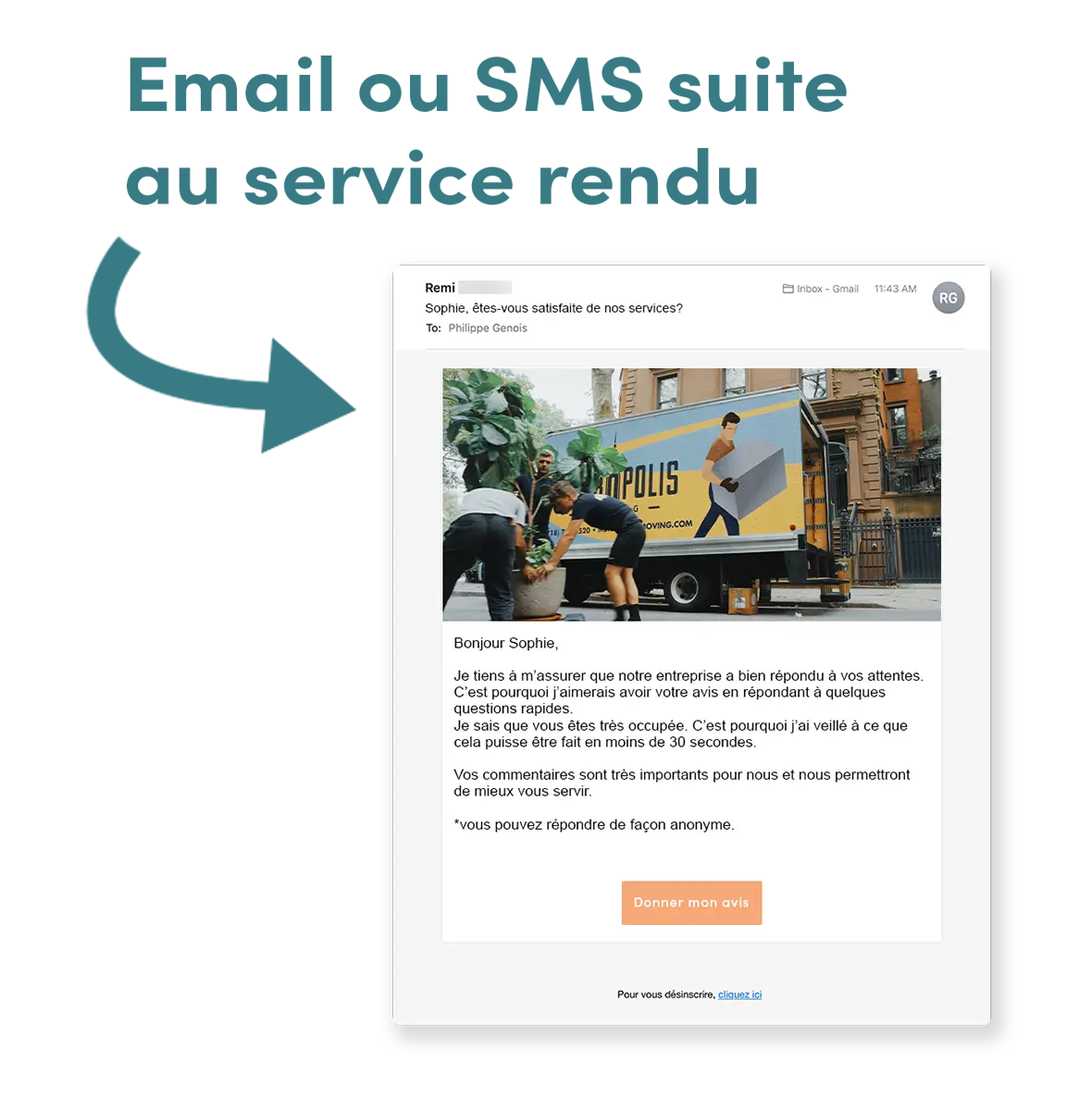 Enfin, chaque client satisfait reçoit automatiquement une invitation à vous laisser un avis en ligne. Cette fonctionnalité est un atout considérable pour votre réputation et pour la motivation de vos employés. À l’aide de nos questionnaires de satisfaction adaptés à vos couleurs, vous montrez à vos clients que leur opinion est sincèrement importante pour vous.