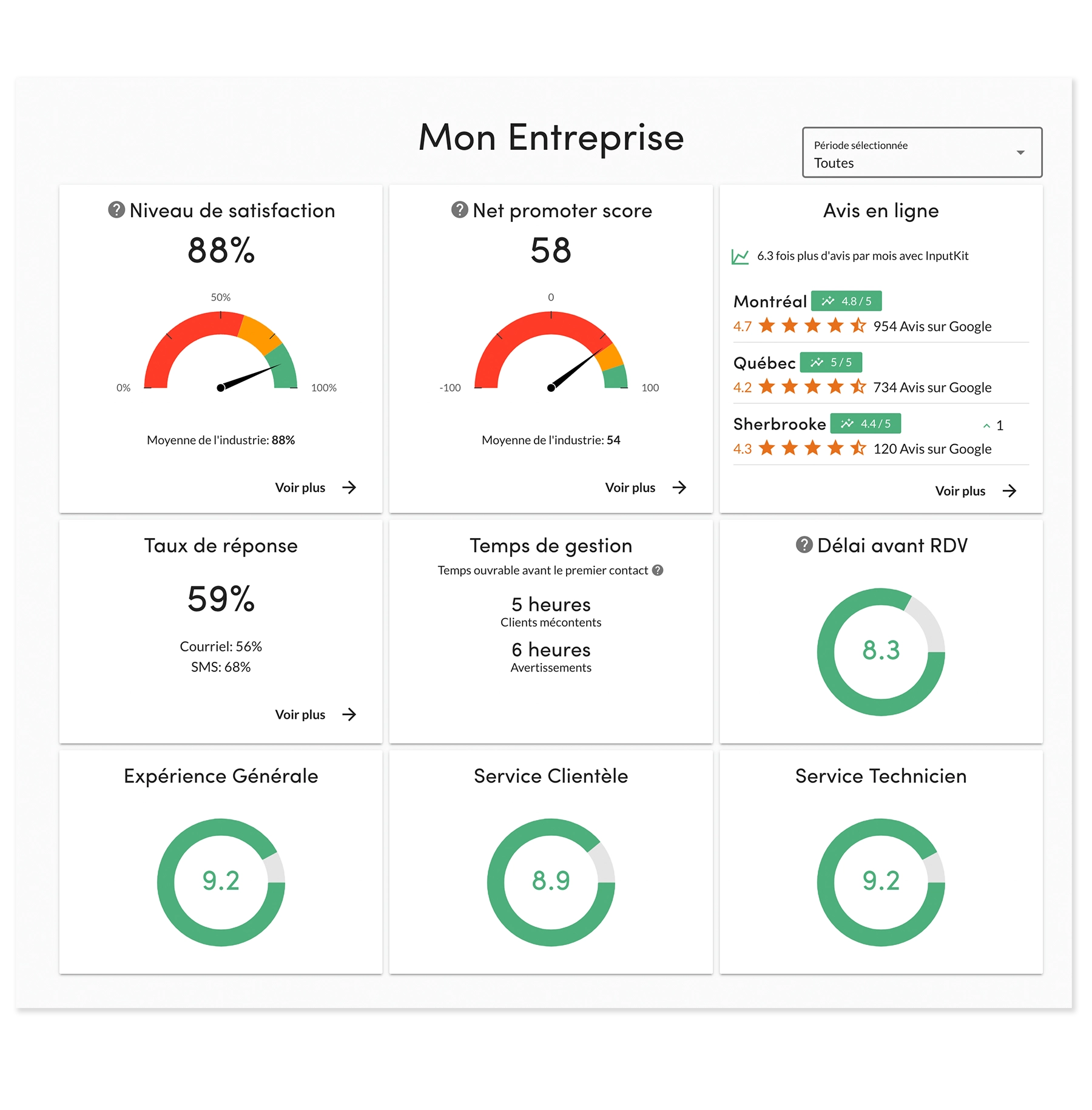Au-delà du NPS, du CES et du CSAT, via InputKit, mesurez plusieurs autres métriques qui vous tiennent à cœur en bâtissant vos propres questions personnalisées. Évolution des avis en ligne, score de performance par employé et plus encore : plusieurs rapports sont disponibles pour suivre l’évolution du service offert par votre entreprise. Ceux-ci vous permettront de rectifier certaines failles au niveau de votre expérience client afin d’offrir à votre clientèle le meilleur service possible. Soyez proactif : implantez notre logiciel d’expérience client afin d’avoir l’heure juste quant à la satisfaction de votre clientèle grâce à des données fiables, en temps réel.
