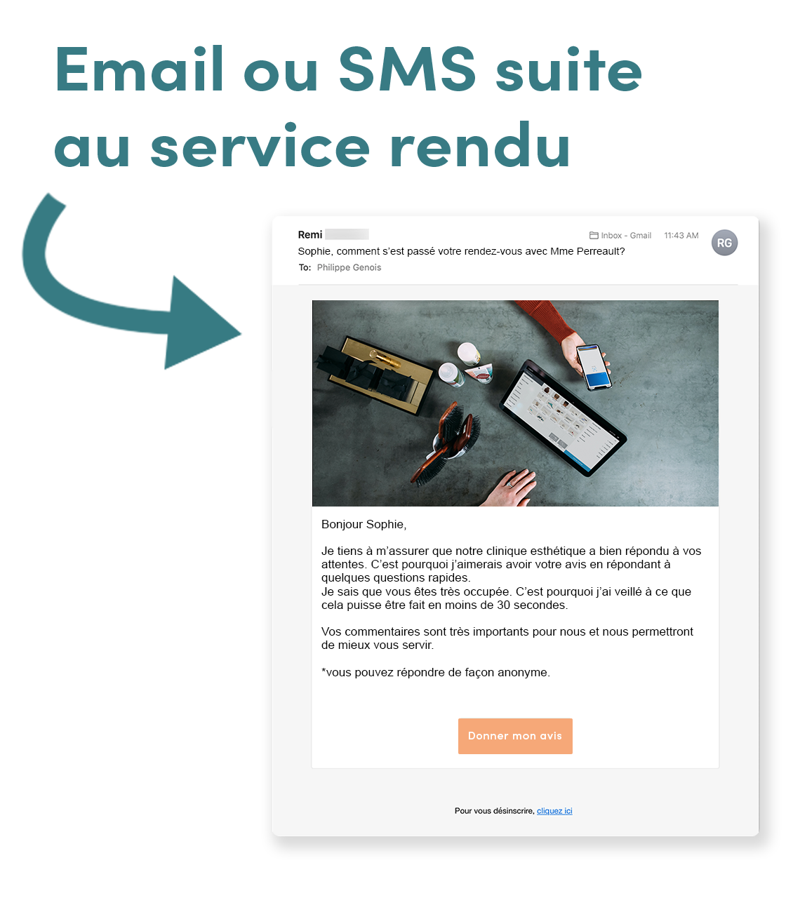 Avec un taux de réponse de 57% par message texte (SMS) et de 49% par courriel, notre logiciel de satisfaction client pour les cliniques esthétiques vous garantit de précieuses rétroactions client et ce, peu importe votre médium préféré.